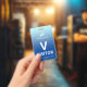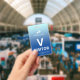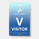 Vertical visitor badge with a simple design against a gradient from pale blue to sky blue. A large white V makes it easy to quickly recognize the visitor as such. Personalize with your business logo.