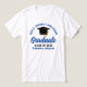 These modern blue script custom senior graduate t-shirts feature your high school or college name for the class of 2025. Customize with your graduating year under the chic handwritten script and black grad cap for a great personalized graduation party tee.