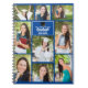 This modern blue senior graduate photo collage notebook features your favorite 9 student photographs. This graduation design features classy white typography of your high school or college name for the class of 2024. Customize this keepsake gift with your graduating year below the black grad cap. It features 2 horizontal pictures, 5 vertical photos, and 2 square photographs.