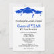 This vertical format minimalist class reunion invitation design features black and blue text on an all white background with three blue graduation caps as the top border. Personalize your information, remove information or edit using the design tool to select a font color, size, and style your prefer.