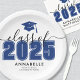 Celebrate this milestone with a stylish and personalized graduation paper plate, perfect for serving food at a graduation party. Featuring "Class of 2026" (or any year) in bold typography, the year and graduation cap icon are highlighted in navy blue, while all other text remains classic black. A simple black frame borders the edges for a polished look.