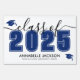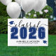 Show off your pride as a parent or welcome guests to a graduation party with this bold and stylish outdoor yard sign. Featuring "Class of 2026" in oversized typography, the year and two graduation cap icons stand out in blue, while all other text remains classic black for a sleek and elegant look. A customizable space below allows you to add the graduate’s name and school for a personal touch.