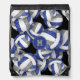 This girls' volleyball drawstring backpack features a pattern of varied size stylized blue, gray and white volleyballs turned every which way - the blue and gray volleyball panels are blended with an artsy, girly floral pattern - customize with athlete's monogram - by katz_d_zynes