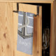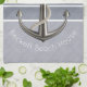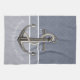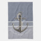 This blue gray toned, nautical style dish towel, features two types of pinstripes and a realistic looking anchor with white rope wrapping around it. Text is customizable.