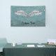 Wide open blue-gray wings illustration. Grunge blue background. Custom text.