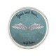 Wide open blue-gray wings illustration. Grunge blue background. Custom text.