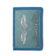 Wide open blue-gray wings illustration. Grunge blue background. Custom text.