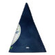 A watercolor blue party hat with the personalizable words that read "Happy Birthday" and your child's name. A watercolor navy and green dinosaur also adorns this cute birthday hat.