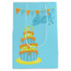 This cute gift bag is perfect for a little boy who loves dinosaurs! The front features an adorable green dinosaur holding a brightly wrapped gift package. Above him is an orange and blue pennant banner. Your custom text is in white near the top. The back of the bag has the same banner with a blue flying dinosaur in front of it, and a birthday cake with candles. Everything is placed on a blue background. Be sure to see the matching party products in our store. *Design credit to Prettygrafikdesign.