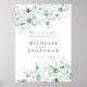 An elegant wedding invitation set featuring watercolor dusty blue and green eucalyptus and other greenery.
