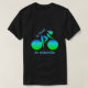 A T-shirt for cyclists that can be personalized with your town's name or other text. Design is an abstract image of a cyclist in a racing helmet astride two wheels. Color is a gradient fill of blues and greens. design works equally well on dark colors or white.