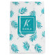 Monogrammed design, blue-green watercolors palm leaves pattern.