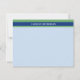 Blue and green personalized note cards with a light blue background, and your name in bold white letters against a deep blue stripe on top of green stripes. Manly personalized flat notecards for your correspondence with your name printed at the top on stripes in blue and green with a light blue background. Personalized notecards for him with green and blue stripes and a light blue background customized with the name.