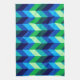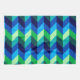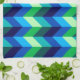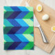 A kitchen towel featuring a colorful, ombre pattern design of chevrons in lime green, royal turquoise, ocean blue and sky blue.