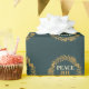 A beautiful blue-green design with golden wreath and writing. Design features white decorative particles dispersed over the background, with a creamy white and gold "Peace, Joy and Love" quote. Background color can be changed to your taste.