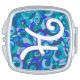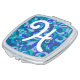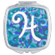 Monogram compact mirror with a design of spirals in multiple shades of blue, green and purple. Personalize with your initial.