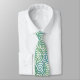 This necktie has a Boho design of overlapping spirals in blue and green on a field of white.