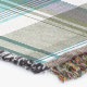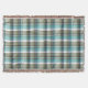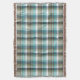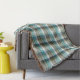 This cozy throw blanket features a traditional turquoise, tan, and white tartan plaid image.
