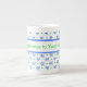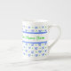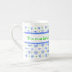 A pretty, customizable bone china coffee mug, with a pattern of bows and spots in blue and green on a white background from a handpainted design by Judy Adamson.! Coordinating tea pot and pitcher also available.