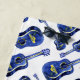 If you love guitars or guitar music, this is the beach towel for you! A cute pattern of blue watercolor guitar images, all different sizes, is placed on a white background. At the bottom is a matching blue oval with your name, monogram, or other custom text.