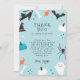 Halloween theme boy's birthday party thank you card featuring illustration of a ghost, black cat, spider, bat, candies, and pumpkins. The text says "thank boo for coming to my party!"