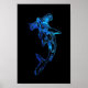 a decorative artwork of a hammerhead shark swimming along in surreal blue colors on a black background as a poster print.