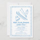 Celebrate your little one on the way with a cozy mountain-inspired "Ski You Soon Little One" baby shower invitation. This winter design features hand-drawn illustrations in soft blue, including skis, poles, a beanie, and a sweet baby bottle—framed by a playful curly doodle border on a crisp white background.