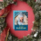 “Happy Hanukkah.” Fun, playful, whimsical handcrafted real gold foil and light blue typography, a random gold foil Star of David pattern, and midnight navy blue hand drawn lines overlay a dark teal blue background. Add the photo of your choice and help usher in Hanukkah with this stunning, colorful, personalized real gold foil greeting card. Hand drawn dark blue lines overlay a light turquoise blue background on the back. Your choice of gold, silver, or rose gold real foil. Feel the warmth and joy of the holiday season whenever you send this festive greeting. Matching stickers, pillows, wrapping paper, serving trays, home décor, and more are also available. Make this Hanukkah one to remember!
