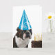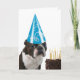 Boston Terrier in big blue birthday hat with cake lots of candles