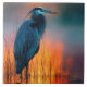 A stunning blue heron standing gracefully in a misty marsh, illuminated by the warm glow of a vivid sunrise.