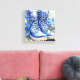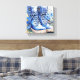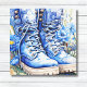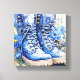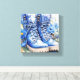 This printed canvas features a charming watercolor-style illustration of blue hiking boots surrounded by delicate blue wildflowers against a crisp white background. The composition is artfully cropped in an intriguing way, blending rustic charm with nature-inspired hues and evoking the simple joys of countryside walks, meadow adventures, and time spent in the great outdoors.