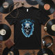 Unleash your inner strength with this striking "Conquer All" Horned Skull T-Shirt. This design is enveloped in a mystical blue ethereal flame.