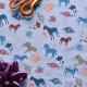 Horse and flower silhouettes in dark blue and red against a cornflower background.