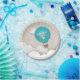 Birthday party plates featuring an illustration of a blue hot air balloon floating in the clouds. Personalize the name and age.