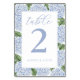 This beautiful floral table number card features watercolor blue hydrangea flowers and your custom text on both sides of the card. Use the template to fill in your information. The "Customize further" feature can be used to change the font (size, style, color), add more lines of text or change the layout.