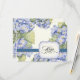 This elegant and sophisticated invitation blends classic and contemporary. This art work is one of Audrey Jeanne Robert's Best Selling and Best Loved collections. Text on the front is from a hand calligraphy font and reads, "RSVP." It is highlighted by being placed in a contemporary bracket shaped frame overlaid on a blue ribbon. The background is make up of hand watercolored blue hydrangea blossoms that have been aged and slightly distress. The reverse side has the same background, a "torn velum" frame digitally overlaid over the design and your wedding text. You might also be interested in: COORDINATING WEDDING ALBUM/BINDER