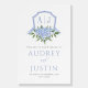 This beautiful design features blue hydrangea blooms and your custom text, along with a personalized watercolor crest. Use the template form to add your information.
