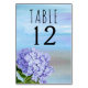 Blue hydrangeas wedding table number card. It showcases blue-purple hortensia or hydrangea flowers on blue and lavender purple watercolor background. Some elements courtesy ArtsyBee, Pixabay.