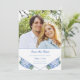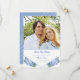Anticipate an elegant garden wedding with this delicate floral save the date. Two hydrangea flowers bloom in the bottom corners of the card, framing soft blue text. You may customize the square photo above. The back features a solid blue color with a minimalist, modern motif. A perfect design for a spring wedding.
