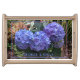 Pretty floral wood serving tray with hydrangea flowers and a place for your text. Purple blue hydrangea blooms are the central image in the photograph of a tropical garden. Other colorful plants and leaves in the background make this an interesting bottom image for either brown or black wood trays. A line of printed text along the bottom of the photo can be used for names or other text. Thin blue and pinkish lines make a border around the design. These sturdy and beautiful serving trays come in two sizes.