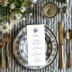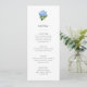 Easy to customize elegant text lists your event's menu options in new traditional grand millennial style and features a clean color palette of white and blue with lots of compositional white space and an antique illustration of a classic blue hydrangea flower.