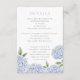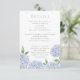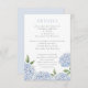 This beautiful blue hydrangea floral wedding enclosure card features watercolor blue flowers and your custom text. The reverse is a thin watercolor stripe, which can be deleted for a solid color back. Use the template to fill in your information. The "Customize further" feature can be used to change the font (size, style, color), and add more lines of text, change the layout and add text to the back.