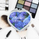 A wedding party gift idea for the bridesmaid! Heart shaped compact mirror featuring a photo image of blue Hydrangea flowers along with bridesmaid's name printed in white, stylized script. A lovely, floral design! Personalize your compact mirror by editing and replacing name.