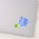 A vinyl sticker featuring a hydrangea flower in a with a variety of blue shades on the flower petal and a single avocado green leaf hand painted with watercolor.