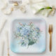Paper plates featuring a watercolor floral bouquet with hydrangeas in pastel blues.