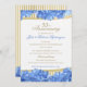 Elegant gold stripes decorated with beautiful floral blue hydrangeas and fancy script text 50th anniversary invitation. Simply customize it to change text and font styles.
