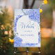 Blue hydrangeas elegant floral arch wedding welcome sign board, botanical watercolor flowers, light blue watercolor background.