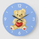 Customizable teddy bear clock with a cute teddy bear holding a red heart and hypnotizing you with its unblinking gaze, on soft blue background. This lovely huggable teddy bear kids clock would be a great gift for kids or someone you love.