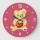 Customizable teddy bear clock with a cute teddy bear holding a red heart and hypnotizing you with its unblinking gaze, on soft blue background. This lovely huggable teddy bear kids clock would be a great gift for girl or someone you love.