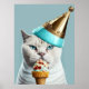 Elevate your wall decor with this humorous and playful wall art collage featuring a blue ice cream king cat wearing a big shiny gold cone on his head. This unique and eye-catching print is perfect for any cat lover who appreciates a touch of whimsy in their home decor.